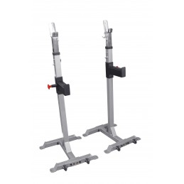 Coppia di appoggi per bilanciere per esercizi squat, dotati di ruote per essere facilmente spostabili all’occorrenza.