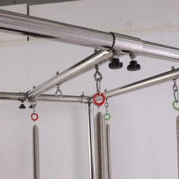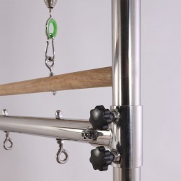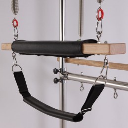 Tutte le parti metalliche sono in acciaio inox e alluminio anodizzato. Barra di stretching in acciaio inox con gomma grip e protezione imbottita. Con cinghia di sicurezza. Molle superiori e inferiori. Regolabile in 3 posizioni.