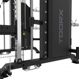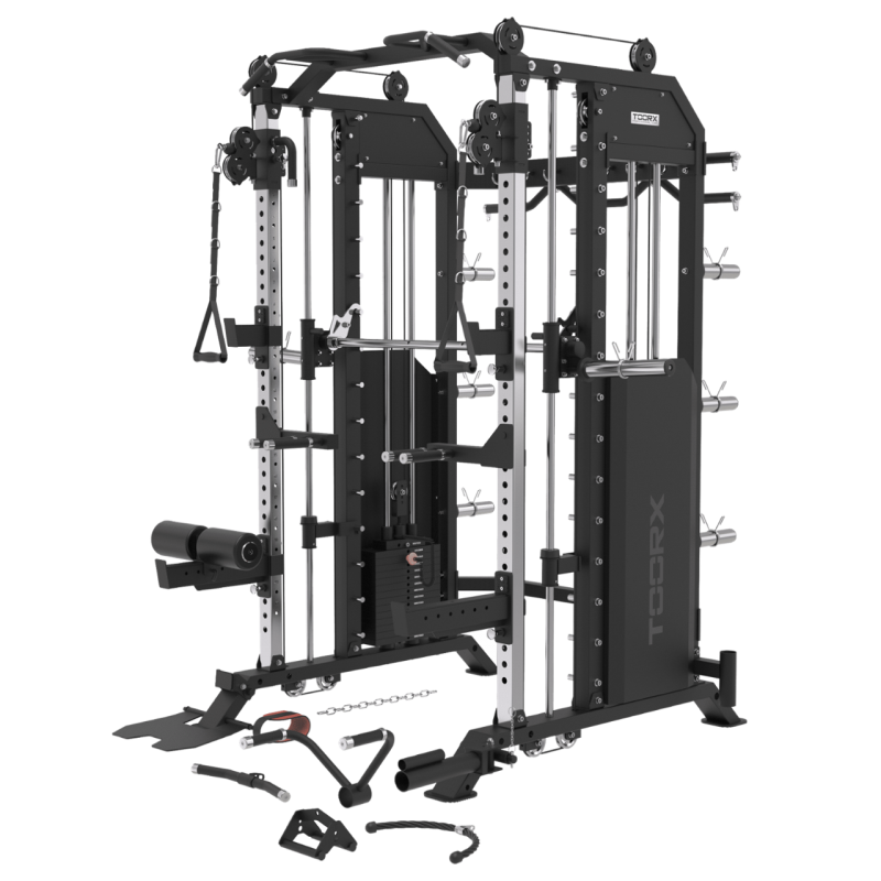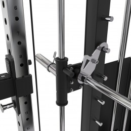 Stazione All in One 3-IN-1 dual pulley, smith machine, rack. 2 J-hook, coppia fermi di sicurezza bilanciere, barra trazioni, parallele, porta bilanciere, 6 porta dischi ø50 mm, 8 ferma dischi a molla ø49 mm.