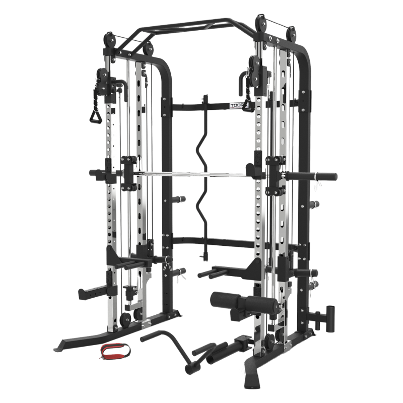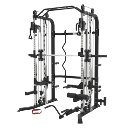 Stazione All in One della linea Vertical Toorx con 3-IN-1 dual pulley, smith machine, rack. 2 J-hook, coppia fermi di sicurezza bilanciere con rulli gambe in foam, barra trazioni, parallele, porta bilanciere, 4 porta dischi ø50 mm e 25 mm, 10 ferma dischi a molla ø49 mm, 10 ferma dischi a mola ø47 mm. Attachments: cavigliera, landmine, 2 maniglie trazioni, bilanciere curl.